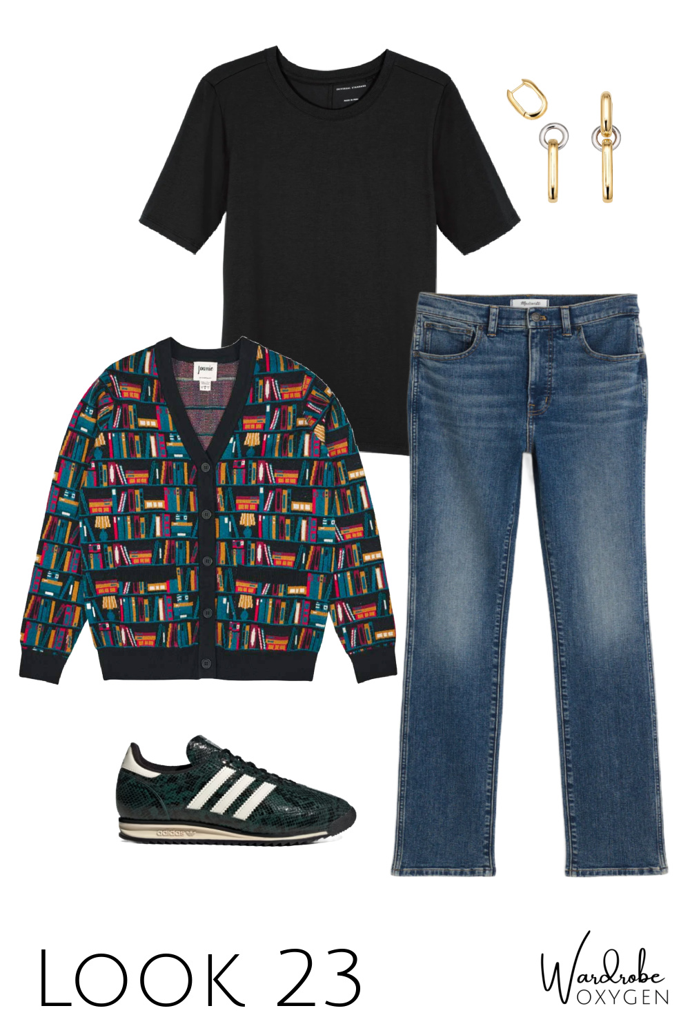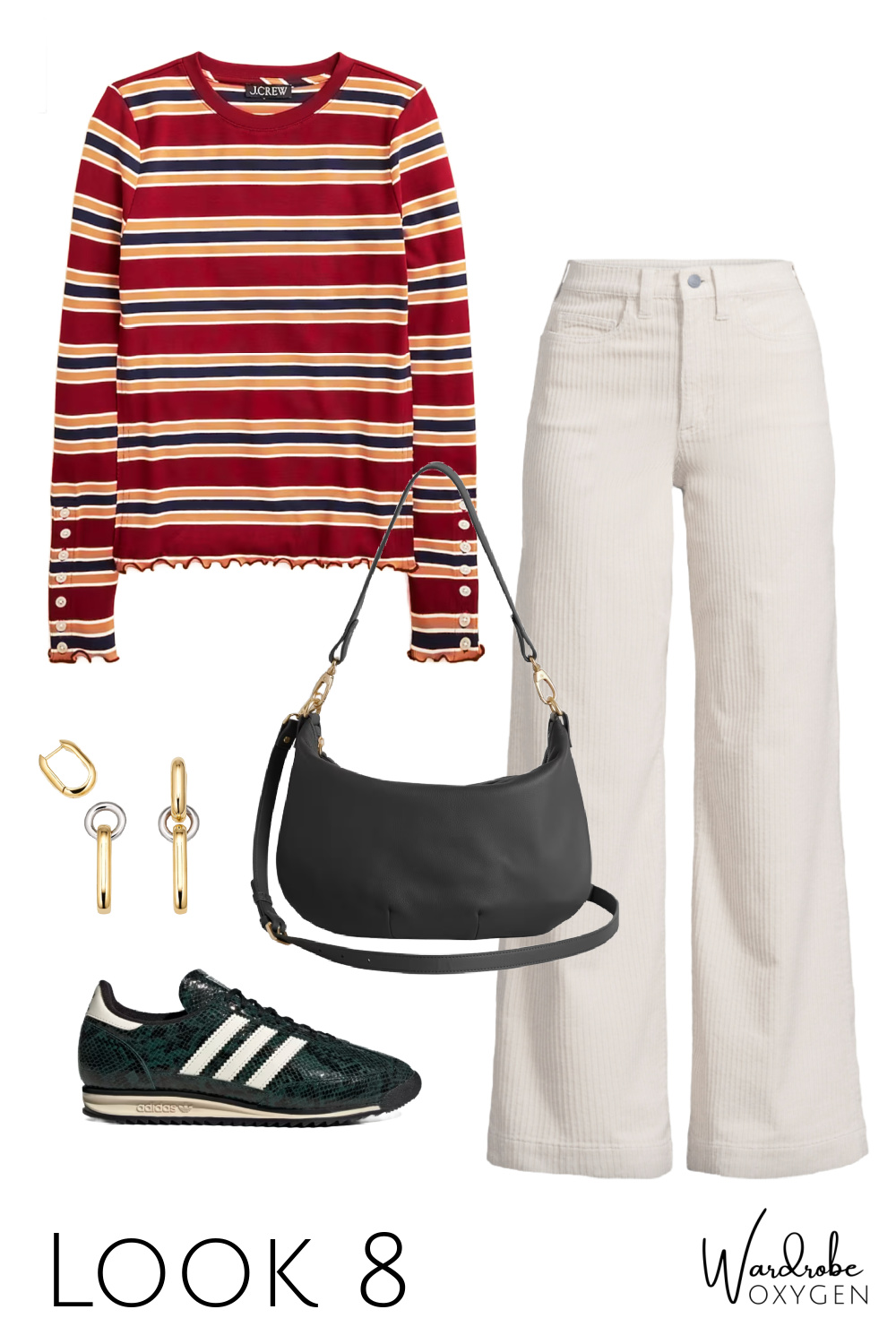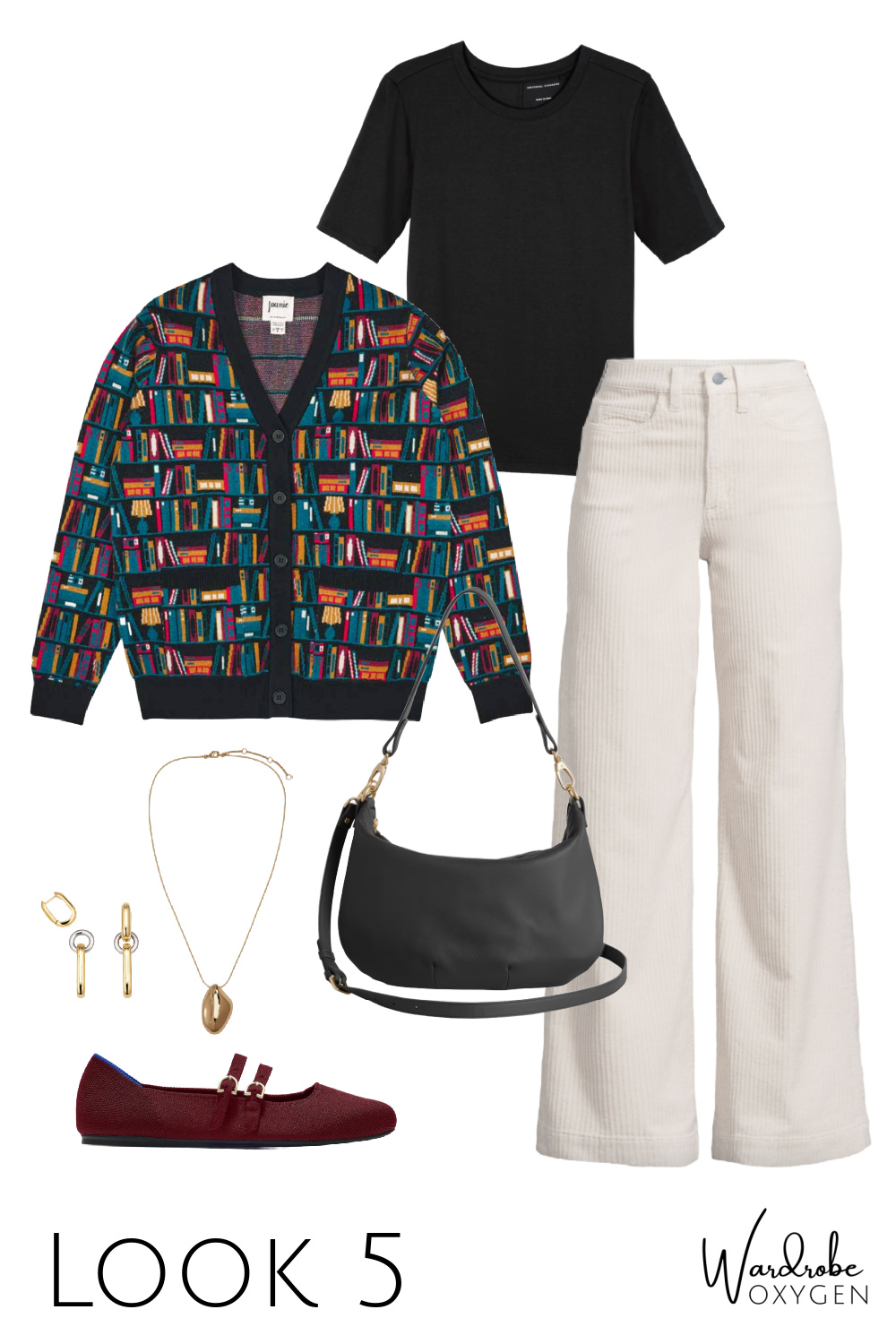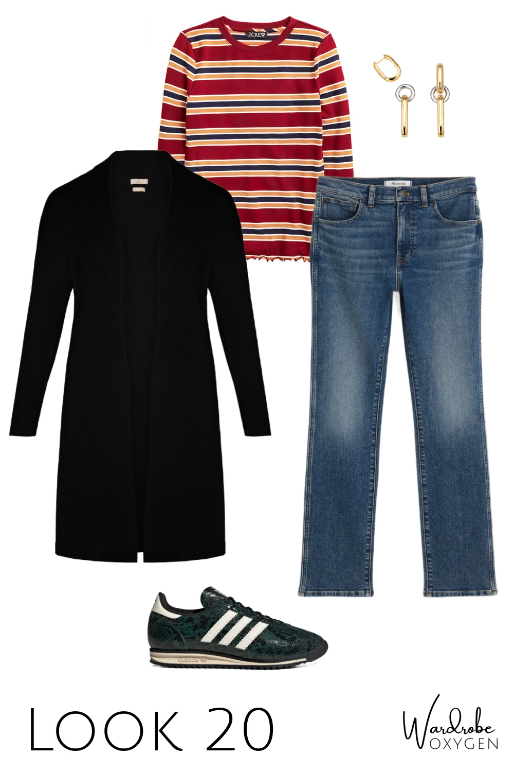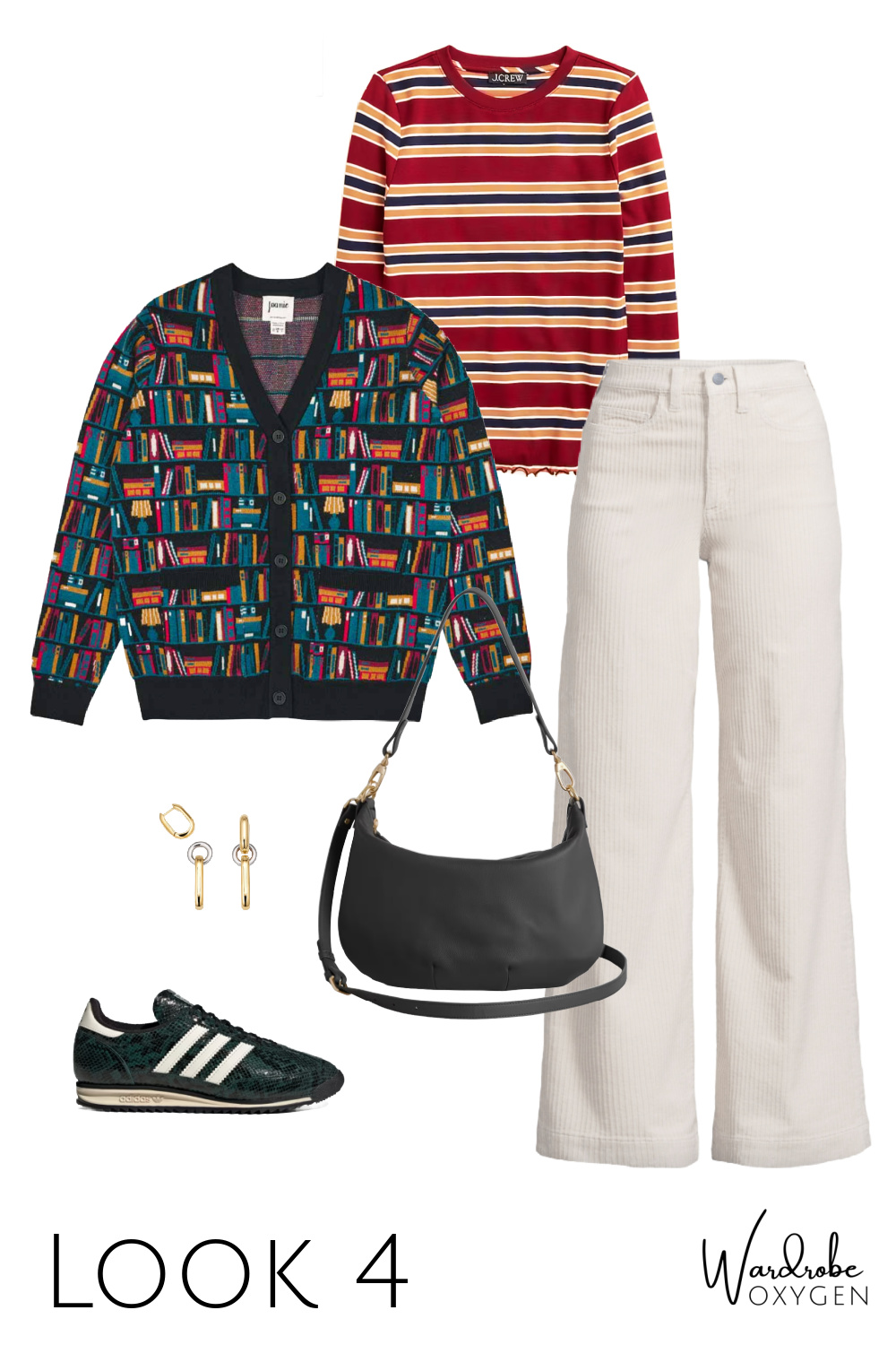While I call this a teacher capsule wardrobe, it clearly can be for any type of person. I started crafting it for a more casual non-work look, but once I saw the cute book cardigan on the Joanie website and then saw a teacher content creator on Instagram in this J. Crew striped top paired with black pants, the person in my mind who would wear this collection was a teacher.